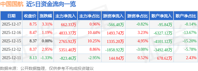 证券之星消息,截至2025年12月17日收盘,中国国航(601111)报收于8.75元,上涨3.31%,换手率0.68%,成交量79.31万手,成交额6.93亿元。