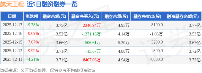 航天工程融资融券信息显示,融资方面,当日融资买入1.37亿元,融资偿还1.13亿元,融资净买入2346.94万元。融券方面,融券卖出8100.0股,融券偿还0.0股,融券余量4.95万股,融券余额123.7万元。融资融券余额3.77亿元。