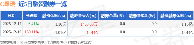 C昂瑞融资融券信息显示,融资方面,当日融资买入6639.61万元,融资偿还5175.82万元,融资净买入1463.8万元,连续3日净买入累计1.16亿元。融券方面,融券卖出0.0股,融券偿还0.0股,融券余量0.0股,融券余额0.0万元。融资融券余额1.16亿元。