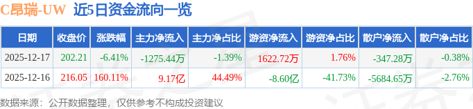 证券之星消息,截至2025年12月17日收盘,C昂瑞(688790)报收于202.21元,下跌6.41%,换手率37.09%,成交量4.47万手,成交额9.21亿元。