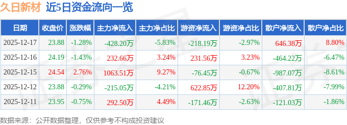 12月17日的资金流向数据方面,主力资金净流出428.2万元,占总成交额5.83%,游资资金净流出218.19万元,占总成交额2.97%,散户资金净流入646.38万元,占总成交额8.8%。