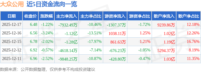 证券之星消息,截至2025年12月17日收盘,大众公用(600635)报收于6.48元,下跌1.22%,换手率4.89%,成交量118.28万手,成交额7.59亿元。
