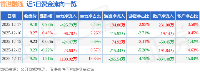 12月17日的资金流向数据方面,主力资金净流出425.79万元,占总成交额6.45%,游资资金净流入194.8万元,占总成交额2.95%,散户资金净流入231.0万元,占总成交额3.5%。