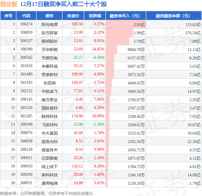 创业板融资净买入前三分别为:阳光电源(300274)融资净买入2.91亿元、东方财富(300059)融资净买入1.99亿元、银邦股份(300337)融资净买入1.7亿元,前20具体见下表: