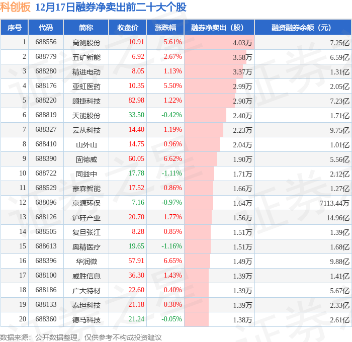 科创板融券净卖出前三分别为:高测股份(688556)融券净卖出4.03万股、五矿新能(688779)融券净卖出3.58万股、精进电动(688280)融券净卖出3.37万股,前20具体见下表: