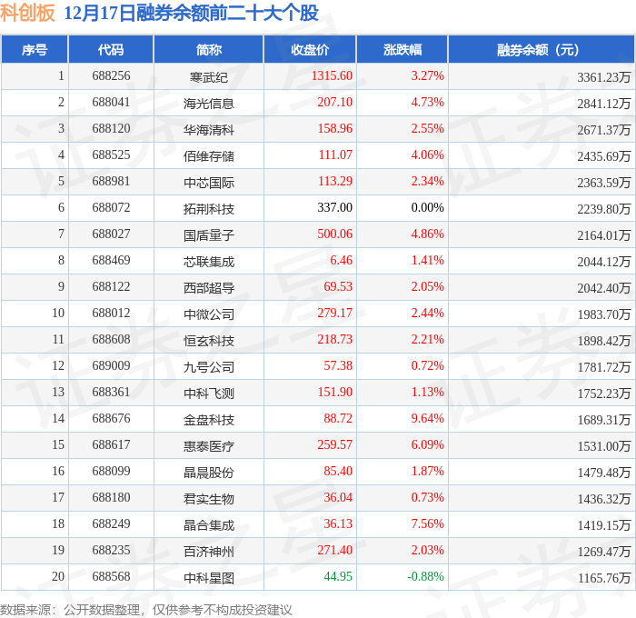 科创板融券余额前三分别为:寒武纪(688256)融券余额3361.23万元、海光信息(688041)融券余额2841.12万元、华海清科(688120)融券余额2671.37万元,前20具体见下表: