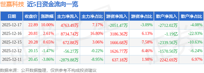 证券之星消息,截至2025年12月17日收盘,世嘉科技(002796)报收于22.89元,上涨10.0%,涨停,换手率13.21%,成交量30.08万手,成交额6.65亿元。