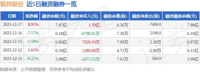 证券之星消息,截至2025年12月17日收盘,银邦股份(300337)报收于13.81元,上涨8.91%,换手率24.48%,成交量174.12万手,成交额22.64亿元。