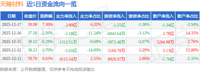 证券之星消息,截至2025年12月17日收盘,天赐材料(002709)报收于39.98元,上涨7.3%,换手率7.74%,成交量116.4万手,成交额45.71亿元。