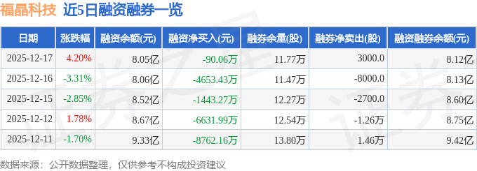 福晶科技融资融券信息显示,融资方面,当日融资买入1.33亿元,融资偿还1.34亿元,融资净偿还90.06万元。融券方面,融券卖出1.28万股,融券偿还9800.0股,融券余量11.77万股,融券余额739.04万元。融资融券余额8.12亿元。