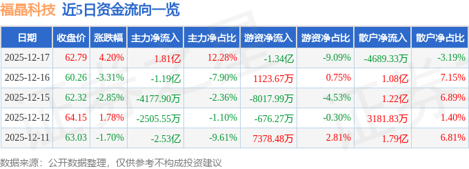 证券之星消息,截至2025年12月17日收盘,福晶科技(002222)报收于62.79元,上涨4.2%,换手率5.11%,成交量23.92万手,成交额14.69亿元。