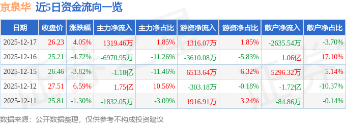 证券之星消息,截至2025年12月17日收盘,京泉华(002885)报收于26.23元,上涨4.05%,换手率12.03%,成交量27.78万手,成交额7.12亿元。