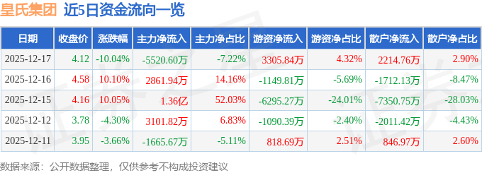 证券之星消息,截至2025年12月17日收盘,皇氏集团(002329)报收于4.12元,下跌10.04%,跌停,换手率27.47%,成交量178.65万手,成交额7.65亿元。
