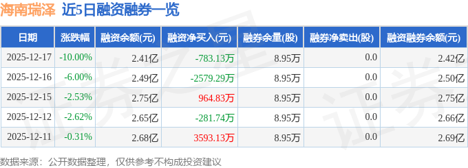 证券之星消息,截至2025年12月17日收盘,海南瑞泽(002596)报收于5.22元,下跌10.0%,跌停,换手率11.28%,成交量129.38万手,成交额6.86亿元。
