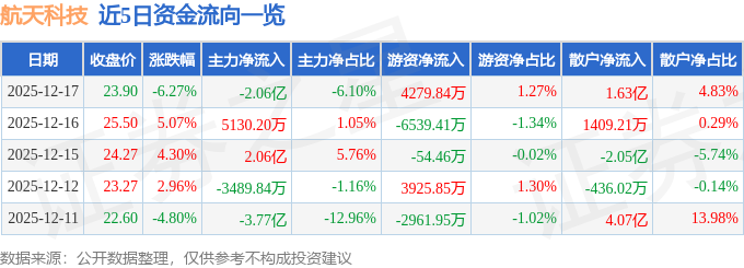 证券之星消息,截至2025年12月17日收盘,航天科技(000901)报收于23.9元,下跌6.27%,换手率17.64%,成交量140.83万手,成交额33.81亿元。