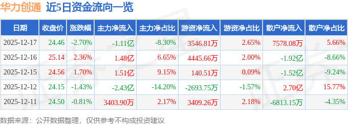 证券之星消息,截至2025年12月17日收盘,华力创通(300045)报收于24.46元,下跌2.7%,换手率10.62%,成交量54.83万手,成交额13.4亿元。