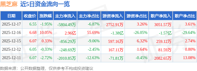 证券之星消息,截至2025年12月17日收盘,黑芝麻(000716)报收于6.55元,下跌1.95%,换手率17.1%,成交量126.33万手,成交额8.45亿元。
