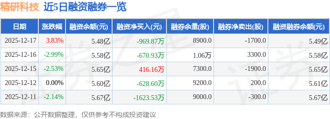 精研科技融资融券信息显示,融资方面,当日融资买入1956.98万元,融资偿还2926.85万元,融资净偿还969.87万元。融券方面,融券卖出0.0股,融券偿还1700.0股,融券余量8900.0股,融券余额38.33万元。融资融券余额5.49亿元。