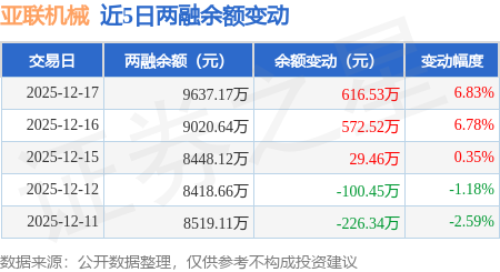 证券之星消息,12月17日,亚联机械(001395)融资买入930.51万元,融资偿还314.37万元,融资净买入616.14万元,融资余额9605.89万元,近3个交易日已连续净买入累计1187.24万元。