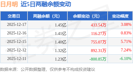 证券之星消息,12月17日,日月明(300906)融资买入3256.25万元,融资偿还2821.25万元,融资净买入435.0万元,融资余额1.45亿元,近3个交易日已连续净买入累计1276.36万元,近20个交易日中有15个交易日出现融资净买入。