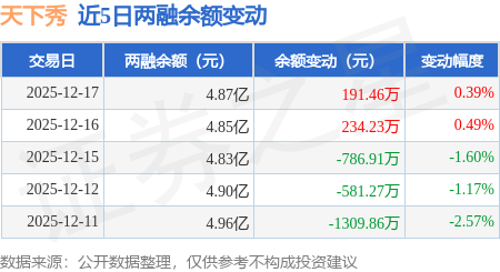 证券之星消息,12月17日,天下秀(600556)融资买入4326.18万元,融资偿还4160.26万元,融资净买入165.92万元,融资余额4.85亿元。