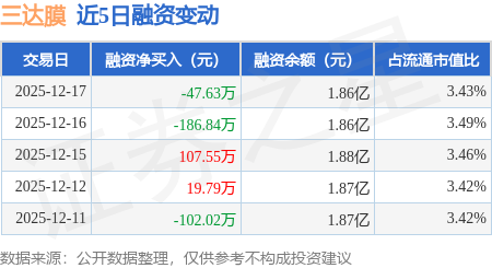 证券之星消息,12月17日,三达膜(688101)融资买入499.83万元,融资偿还547.46万元,融资净卖出47.63万元,融资余额1.86亿元。