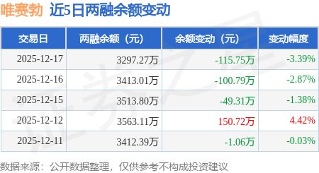 证券之星消息,12月17日,唯赛勃(688718)融资买入58.64万元,融资偿还174.38万元,融资净卖出115.75万元,融资余额3297.27万元。