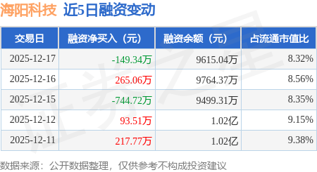证券之星消息,12月17日,海阳科技(603382)融资买入793.77万元,融资偿还943.1万元,融资净卖出149.34万元,融资余额9615.04万元,近20个交易日中有11个交易日出现融资净买入。