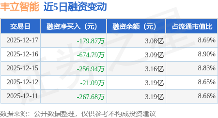 证券之星消息,12月17日,丰立智能(301368)融资买入1200.02万元,融资偿还1379.89万元,融资净卖出179.87万元,融资余额3.08亿元。