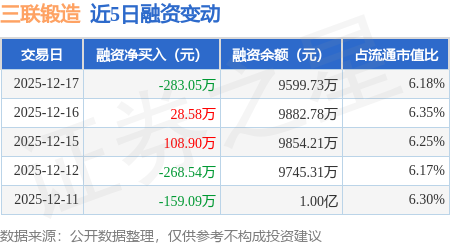 证券之星消息,12月17日,三联锻造(001282)融资买入490.76万元,融资偿还773.81万元,融资净卖出283.05万元,融资余额9599.73万元。