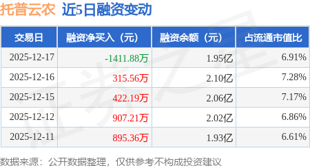 证券之星消息,12月17日,托普云农(301556)融资买入1920.45万元,融资偿还3332.33万元,融资净卖出1411.88万元,融资余额1.95亿元,近20个交易日中有11个交易日出现融资净买入。