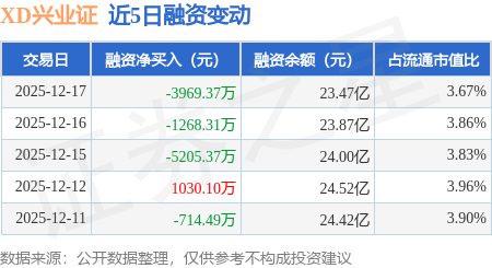 证券之星消息,12月17日,XD兴业证(601377)融资买入2.72亿元,融资偿还3.11亿元,融资净卖出3969.37万元,融资余额23.47亿元。