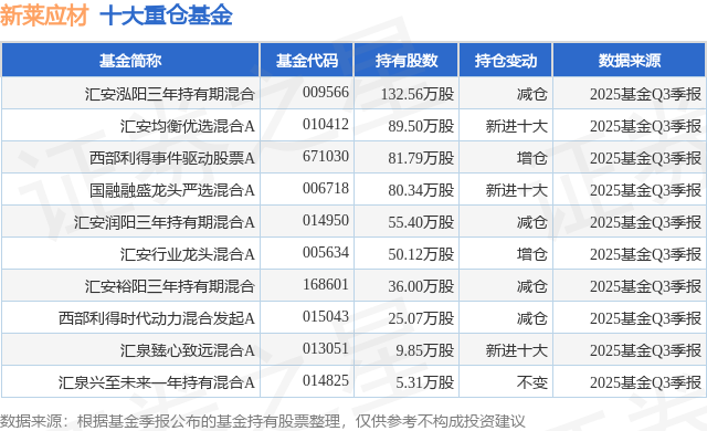根据2025基金Q3季报公募基金重仓股数据,重仓该股的公募基金共10家,其中持有数量最多的公募基金为汇安基金的汇安泓阳三年持有期混合。汇安泓阳三年持有期混合目前规模为7.58亿元,最新净值1.32(12月17日),较上一交易日下跌0.38%,近一年上涨38.41%。该公募基金现任基金经理为邹唯。邹唯在任的基金产品包括:汇安裕阳三年持有期混合,管理时间为2018年9月27日至今,期间收益率为127.32%;汇安行业龙头混合A,管理时间为2019年8月28日至今,期间收益率为144.22%;汇安均衡优选混合A,管理时间为2021年2月9日至今,期间收益率为11.16%。