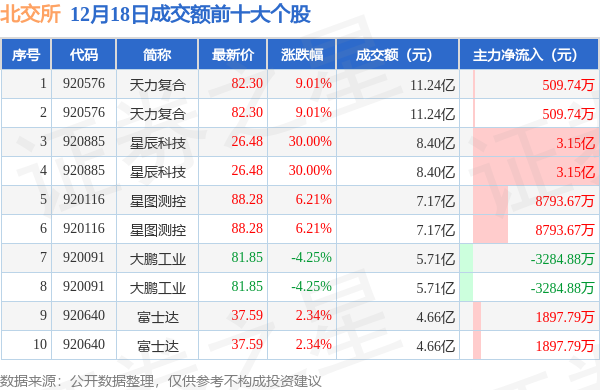 当日北交所成交额前10大个股中8只个股收涨,平均涨幅11.89%,其中天力复合(920576)以成交额11.24亿元排第一。从主力资金流入看,成交额前10大个股中有8只个股呈现主力资金净流入。