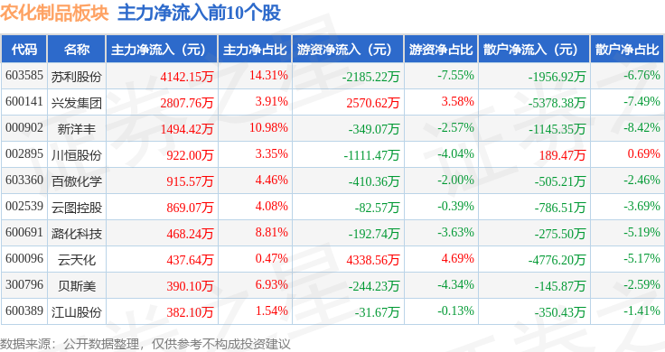 从资金流向上来看,当日农化制品板块主力资金净流出4.29亿元,游资资金净流入1.25亿元,散户资金净流入3.03亿元。农化制品板块个股资金流向见下表: