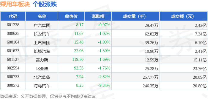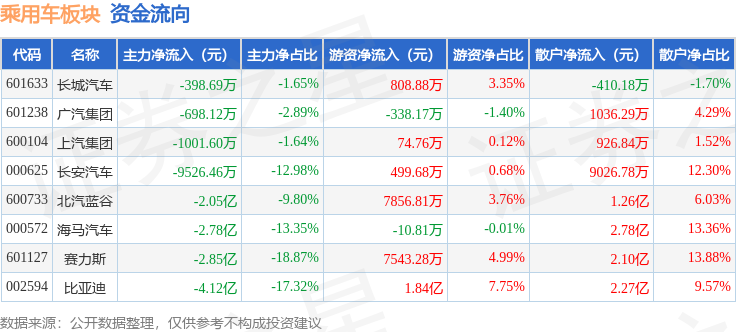 从资金流向上来看,当日乘用车板块主力资金净流出12.95亿元,游资资金净流入3.48亿元,散户资金净流入9.47亿元。乘用车板块个股资金流向见下表: