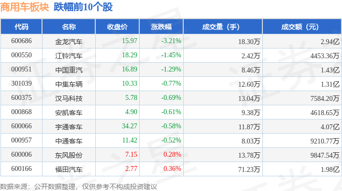 证券之星消息,12月18日商用车板块较上一交易日下跌0.11%,金龙汽车领跌。当日上证指数报收于3876.37,上涨0.16%。深证成指报收于13053.98,下跌1.29%。商用车板块个股涨跌见下表: