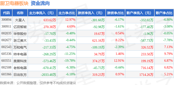 从资金流向上来看,当日厨卫电器板块主力资金净流出2910.1万元,游资资金净流入819.61万元,散户资金净流入2090.49万元。厨卫电器板块个股资金流向见下表:
