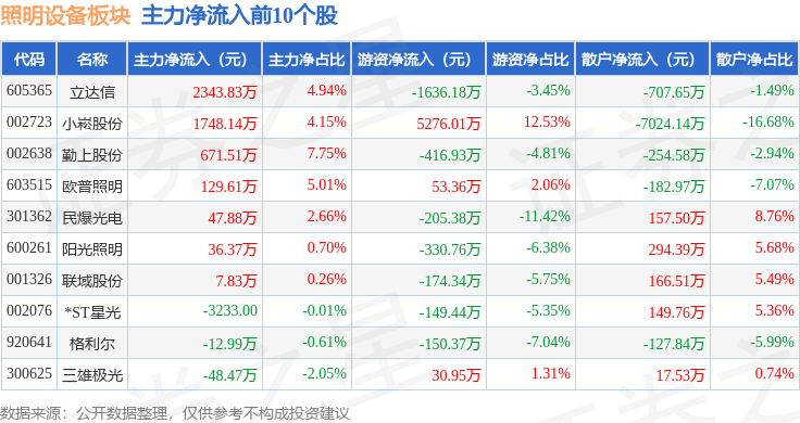 从资金流向上来看,当日照明设备板块主力资金净流入4484.86万元,游资资金净流入2775.16万元,散户资金净流出7260.03万元。照明设备板块个股资金流向见下表: