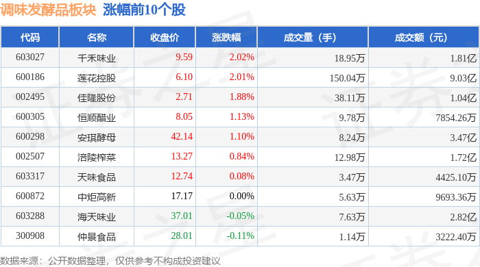 证券之星消息,12月18日调味发酵品板块较上一交易日上涨0.08%,千禾味业领涨。当日上证指数报收于3876.37,上涨0.16%。深证成指报收于13053.98,下跌1.29%。调味发酵品板块个股涨跌见下表: