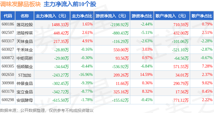 从资金流向上来看,当日调味发酵品板块主力资金净流出1.07亿元,游资资金净流出707.4万元,散户资金净流入1.14亿元。调味发酵品板块个股资金流向见下表: