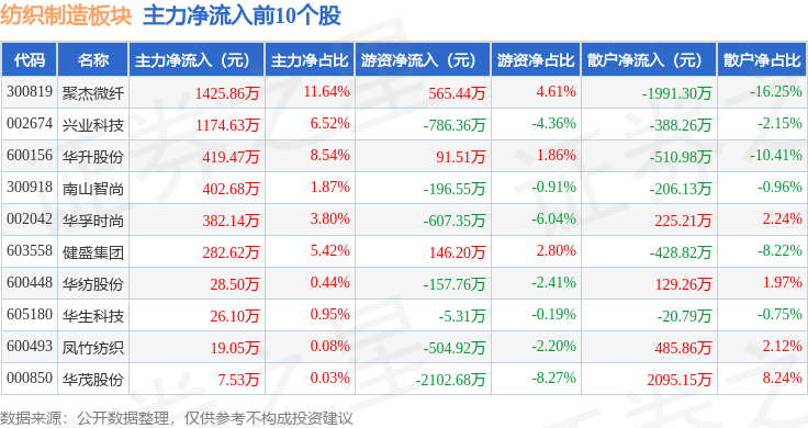 从资金流向上来看,当日纺织制造板块主力资金净流出2.08亿元,游资资金净流入5514.67万元,散户资金净流入1.53亿元。纺织制造板块个股资金流向见下表: