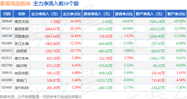 从资金流向上来看,当日家居用品板块主力资金净流入6802.44万元,游资资金净流出1.5亿元,散户资金净流入8183.77万元。家居用品板块个股资金流向见下表: