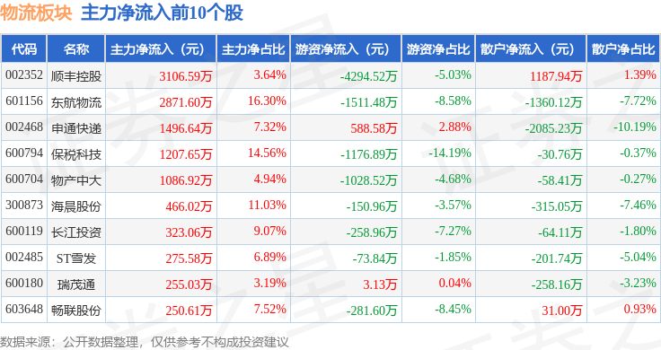 从资金流向上来看,当日物流板块主力资金净流出1.73亿元,游资资金净流入2357.31万元,散户资金净流入1.49亿元。物流板块个股资金流向见下表: