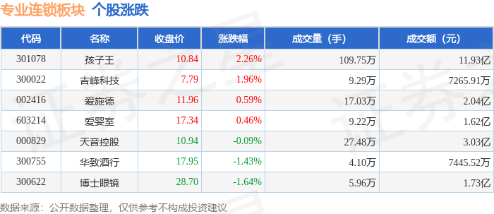证券之星消息,12月18日专业连锁板块较上一交易日上涨0.49%,孩子王领涨。当日上证指数报收于3876.37,上涨0.16%。深证成指报收于13053.98,下跌1.29%。专业连锁板块个股涨跌见下表: