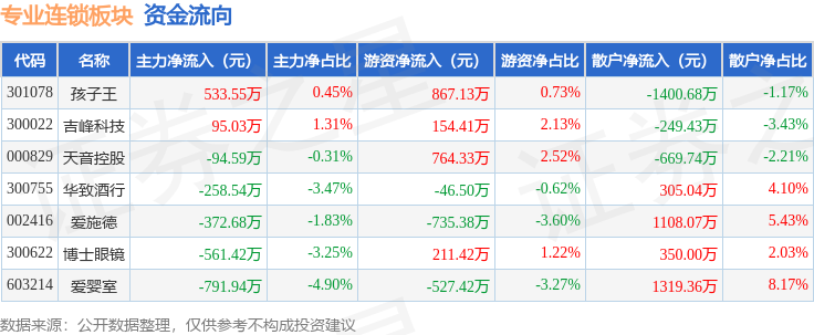 从资金流向上来看,当日专业连锁板块主力资金净流出1450.6万元,游资资金净流入687.98万元,散户资金净流入762.62万元。专业连锁板块个股资金流向见下表: