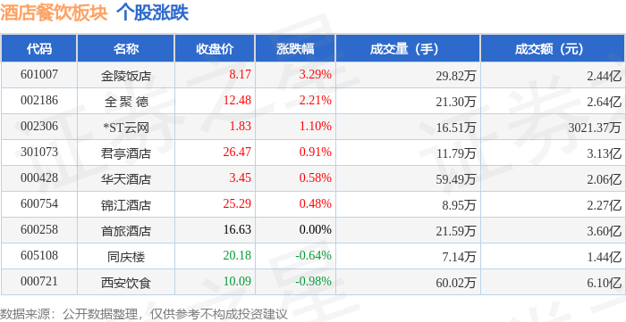 证券之星消息,12月18日酒店餐饮板块较上一交易日上涨0.42%,金陵饭店领涨。当日上证指数报收于3876.37,上涨0.16%。深证成指报收于13053.98,下跌1.29%。酒店餐饮板块个股涨跌见下表: