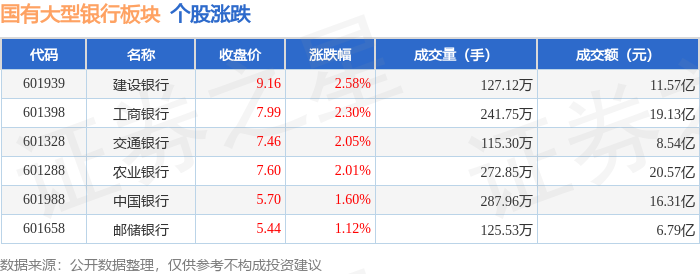 证券之星消息,12月18日国有大型银行板块较上一交易日上涨1.99%,建设银行领涨。当日上证指数报收于3876.37,上涨0.16%。深证成指报收于13053.98,下跌1.29%。国有大型银行板块个股涨跌见下表: