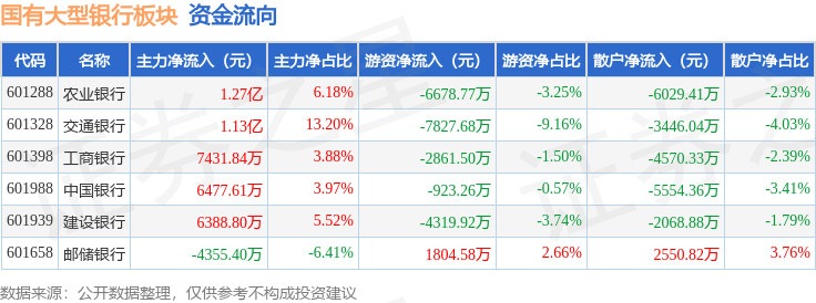 从资金流向上来看,当日国有大型银行板块主力资金净流入3.99亿元,游资资金净流出2.08亿元,散户资金净流出1.91亿元。国有大型银行板块个股资金流向见下表: