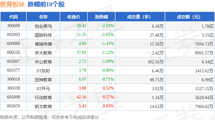 证券之星消息,12月18日教育板块较上一交易日下跌0.27%,创业黑马领跌。当日上证指数报收于3876.37,上涨0.16%。深证成指报收于13053.98,下跌1.29%。教育板块个股涨跌见下表: